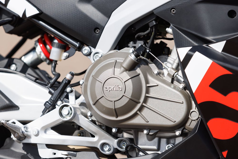 The RS 457 comes stock with TVS Eurogrip Protorq Extreme tires. The unit I tested came shod in Pirelli Diablo Supercorsa SP V4 tires. That’s the first mod I’d make. Aprilia photo.