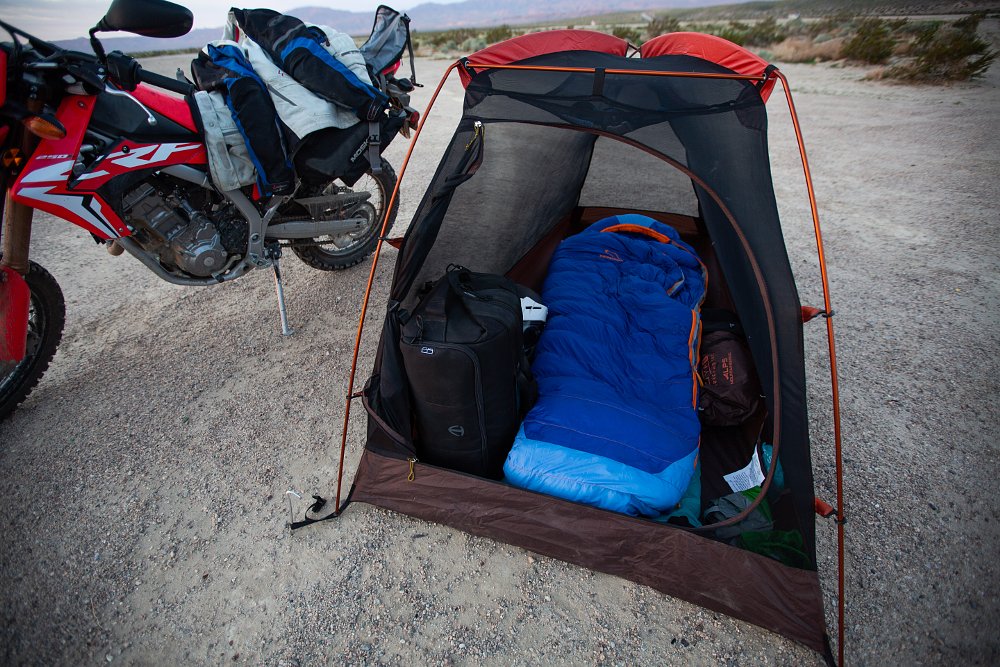 We planned to be off the grid for a few days in order to torture test the durability of the Chinese- and Indian-made ADVs, so I loaded my camping supplies into a Reckless 40L luggage system, stuffed the cameras into a Tenba Cineluxe 21 backpack, and hit the road on a (Thailand-made) CRF250L. The first bit of riding was a 130-mile stint on the freeway and I wasn’t confident my steed would hang with the larger, touring-oriented bikes Zack and Ari were riding.