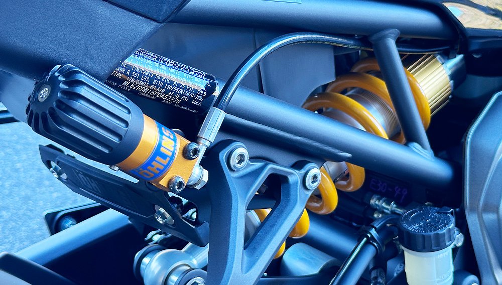 As long as conditions remain favorable, the SE’s up-spec hardware works in concert. Sometimes, a bike’s suspension is too soft for its brakes or its stopping power doesn’t match its horsepower. That’s not the case here. The Brembo binders and Öhlins shock are neither brand’s top-shelf offering, but they complement each other, especially at a fast clip.