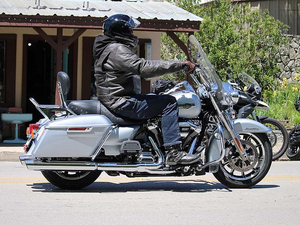 Hopping onto the freeway, the Road King’s throttle quickly responded to the slightest input and rewards riders with an urgent surge of torque off idle. The Milwaukee 8 engine puts out a claimed 111 ft-lb of torque at 3250 rpm but much of that power can be tapped into as early as 2000 rpm. Winding out first gear, the King hustles to just under 45 mph before signing off abruptly as it hits the rev limiter. Second gear engages solidly and propels the big bike to just under 65 mph with a bit more overrev up top. The powerband of the Milwaukee 8 is more linear than the Twin Cam 96, and while the power gains are noticeable, the spread is about the same in the lower gears. With a bike that tips the scales with a curb weight of 836 pounds, the bike would benefit from being able to wind out the first two gears just a little bit more. Getting up to highway speed and motoring along in fifth gear, it’s easy to navigate through traffic thanks to an abundance of roll-on power. Settling into the flow of traffic and dropping into sixth gear, the 2019 Road King is in its happy place as it hums along smoothly at 2800 rpm with the speedometer ticking 75 mph. With a judicious throttle hand, you can squeeze about 240 miles out of its six-gallon tank as the 2019 RK averaged 42.72 mpg over the course of our 650-mile journey. Cruise control is a standard feature on the left switchgear housing and is easily operable with a thumb, another handy feature which facilitates the motorcycle’s efficiency.