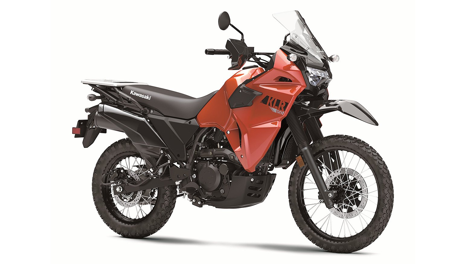 The KLR650 will be available in Pearl Lava Orange, Pearl Sand Khaki, and Cypher Camo Grey.