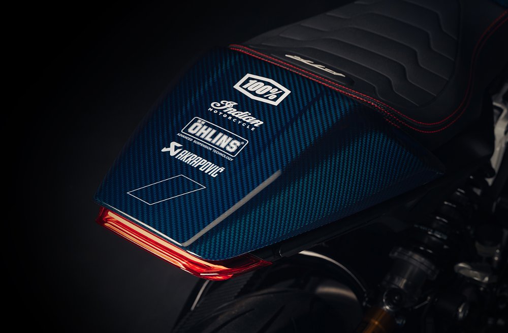 The FTR x 100% R Carbon makes good on its name with a model-exclusive carbon fiber chain guard, exhaust heat shield, and engine covers. Gilles Tooling contributes to the cause in the form of an oil cap, radiator cap, and bar-end weights.