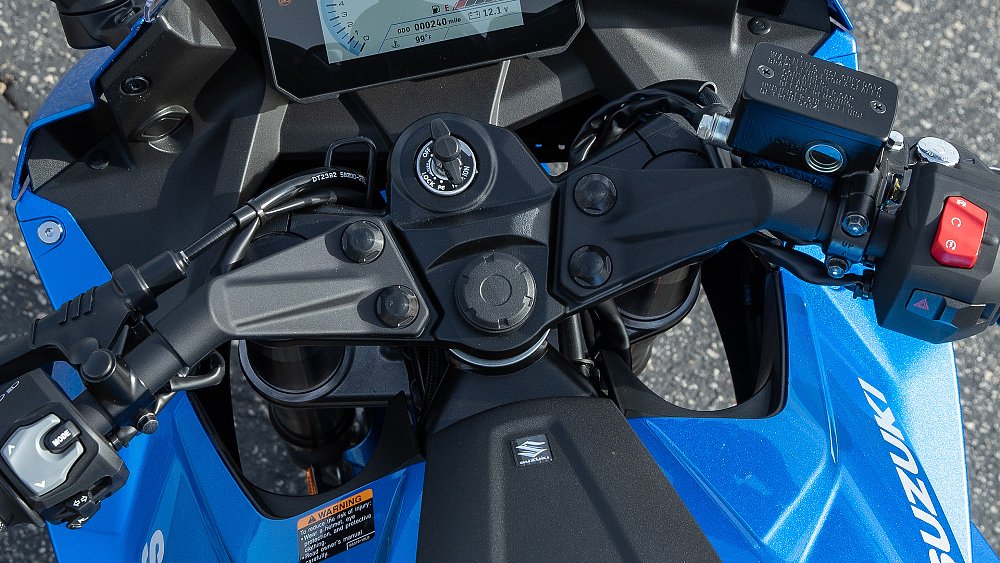 The p-twin’s amiable nature helps Suzuki cast the GSX-8R as a “bike of different purposes” — commuting and sport-touring included. Covering over 100 miles of backroad highways put the model’s travel ambitions to the test and its ergonomics passed with flying colors. The 8R carries over the 8S’s 31.9-inch seat height and low footpegs, but its yoke-mounted “clip-ons” are 2.3 inches lower and 0.2 inches further forward. That new touchpoint pulls the rider over the tank, but only slightly more so than the GSX-8S.
