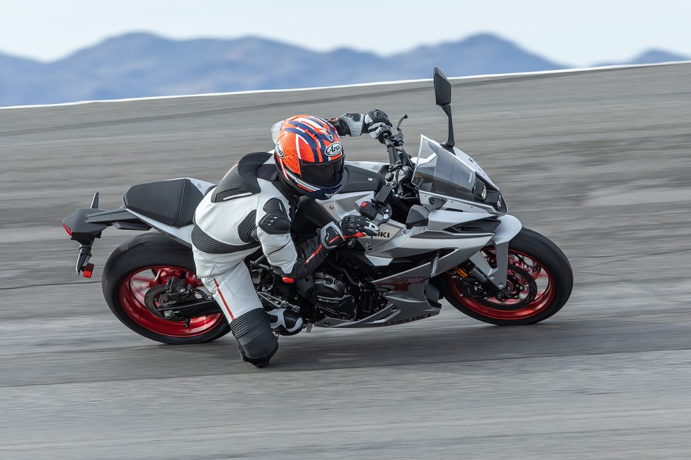 Suzuki hosted the second day of the GSX-8R launch at Chuckwalla Valley Raceway. To cope with the higher speeds and lean angles achieved on track, the brand replaced the stock rubber with Dunlop Sportmax Q5S tires. Its stickier compound not only unlocked the 8R’s performance potential but also complemented the sport bike’s true advantage: upgraded suspension.