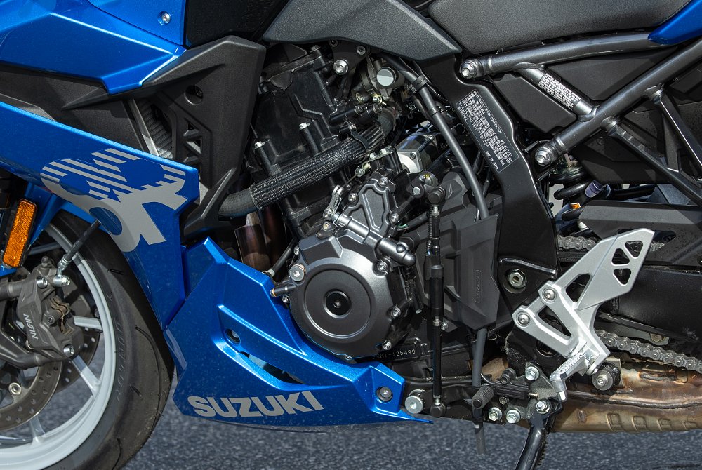 Suzuki doesn’t fix what isn’t broken. In the GSX-8R, the mill maintains the same state of tune from the 800DE and 8S. That includes its 81.8-horsepower rating. However, the twin’s torque provides an immediate thrill, piling on from the initial throttle crack and only trailing off after its claimed peak of 57.5 foot-pounds at 6,800 rpm while horsepower steadily gallops up to its 8,500-rpm summit. With such a linear power profile, the engine is less of a Quarter Horse and more of a work horse. It’s that mix of low-down pull and sensible acceleration that keeps the 8R engaging yet unintimidating.