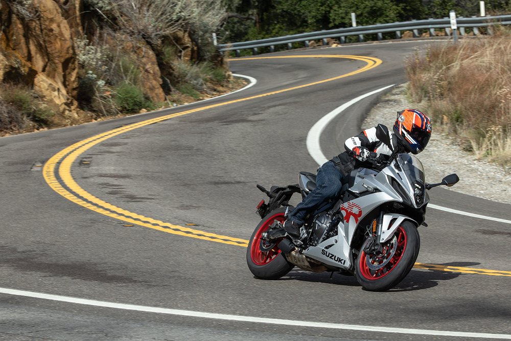 Most importantly, my grip on the clip-ons remained light and relaxed. Without weight bearing down on wrists and shoulders, stretching routines and popping joints didn’t dominate our rest stops. (More time for snacks. Hooray!). Ample leg room only contributed to the cause, with my knees at a near-90-degree angle and my tuchus resting flat on its sit bones. It’s that naked-bike-like rider triangle that makes 8R so appealing, but its fairing also staves off fatigue. Instead of deflecting all wind away from the rider, Suzuki designers stabilized the oncoming air with strategically placed inlets in the bodywork. The results were largely successful. Though the short windscreen directed wind to my clavicle area, the airstream was far from turbulent. With clean air passing over my shoulders and helmet, neck pain was nil.