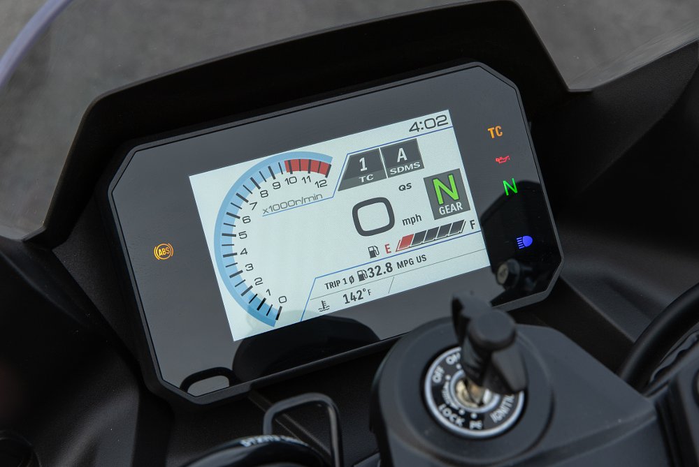 The model’s five-inch TFT aids in those instances. Featuring an analog-style tachometer, oversized speed readout, and a large gear indicator, clarity ranks high on the dash’s priority list. The screen doesn’t wow with snazzy graphics. It’s neither the sharpest nor the largest display either. It is, on the other hand, one of the easiest interfaces to navigate. With the current ride mode and traction control positioned just right of center, adapting the 8R’s settings is a glance and a few button presses away. Easy-peasy.