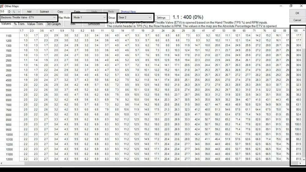 At the 2:22 mark in the video, Verdecchia presents a second-gear throttle table, which records the electronic throttle valve (ETV) opening at a given throttle position (top row) and rpm (far left column). We’re most interested in the far right column, which lists EVT values at 100% throttle. Between 1,300 and 4,000 rpm the valves only open to 30.6% of capacity. It jumps to 38.2% by 6,000 rpm and shoots up to 98% by 8,500 rpm. Only by 9,000 rpm are both the throttle and throttle valves 100% open.