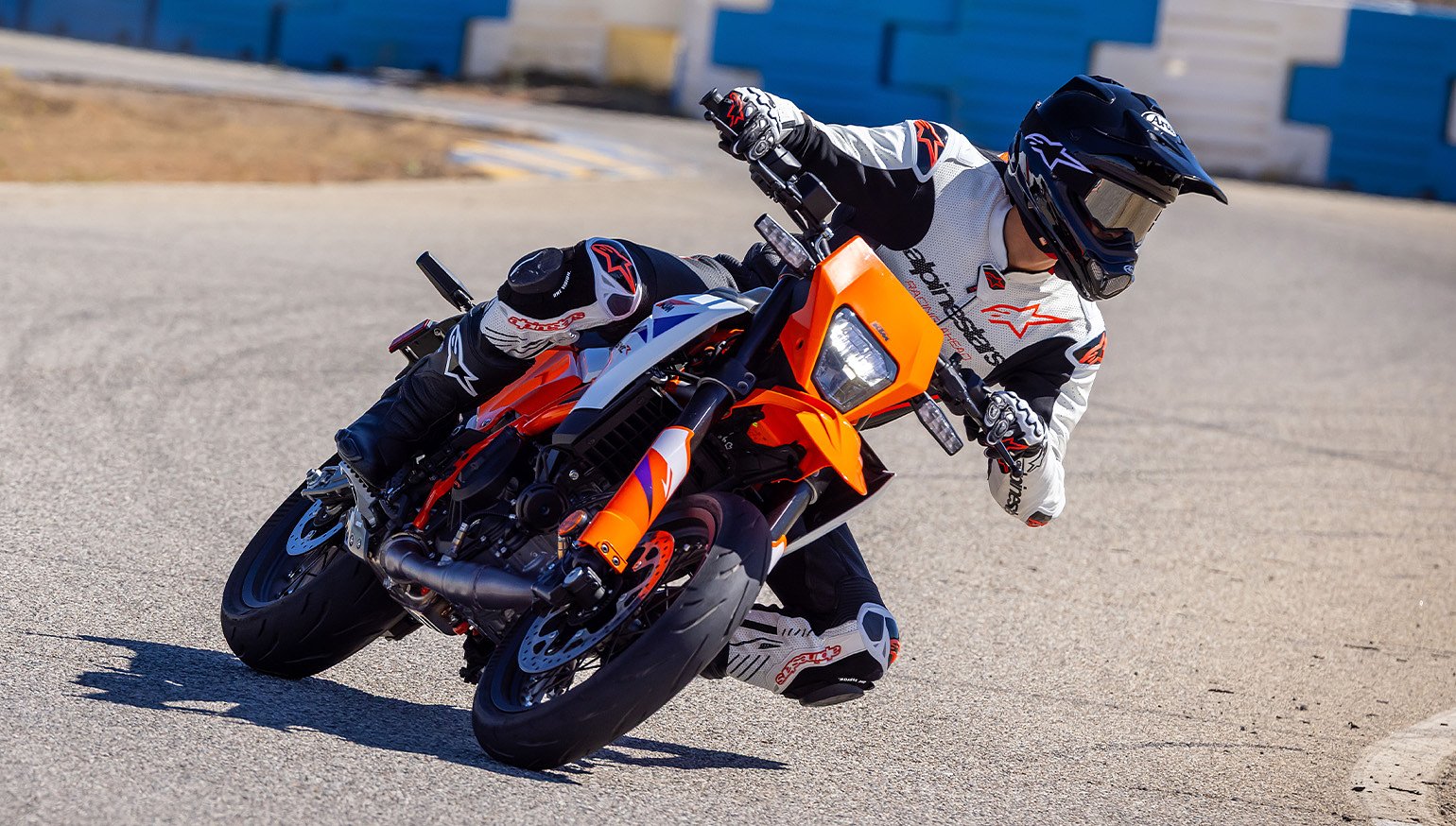 As Sarancha stressed, the 390 SMC is not the 450 SMR. Its brakes deliver adequate stopping force, but don’t expect race-worthy power or feedback. The suspension remains composed under heavy braking, but the shock doesn't handle g-outs well. Plus, the track's dirt section was off limits during our sessions (that speaks volumes, if you ask me). The SMC obviously has its limitations, and many of them rear their heads when the lean angles rise.