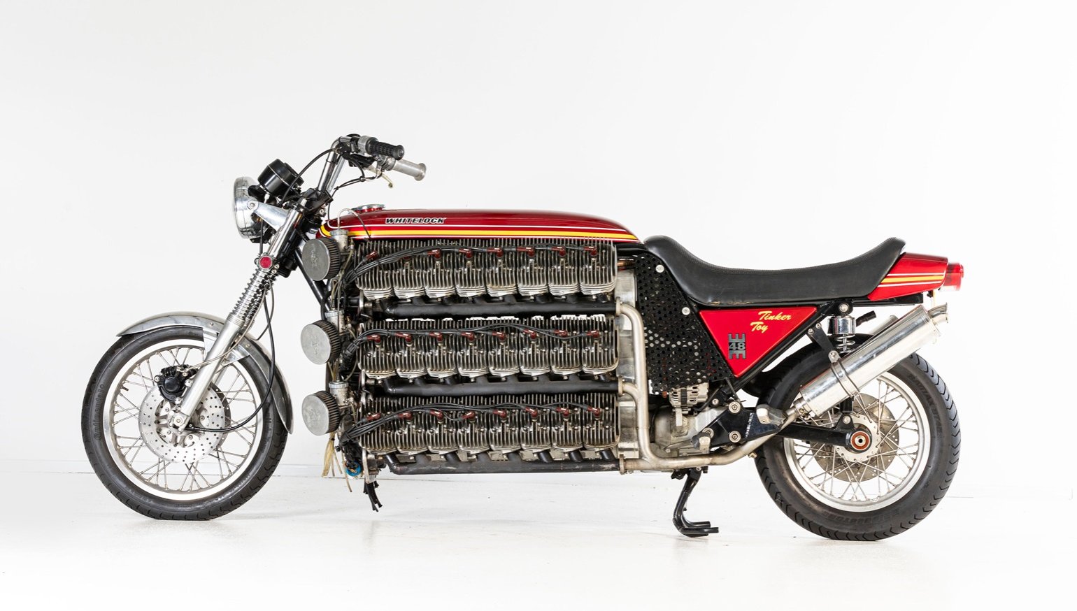 This oddity has been around for a quarter of a century now, so you may have seen it before. But now you can actually buy it. This homebuilt 48-cylinder motorcycle goes up for sale at the Bonhams Spring Stafford Sale in England next month.