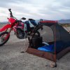 The Zephyr 1-Person Tent and Peregrine Altai 0 Down Blend Sleeping Bag fit easily into the Reckless 40L luggage and made for a perfect moto-camping setup. Photo by Spenser Robert