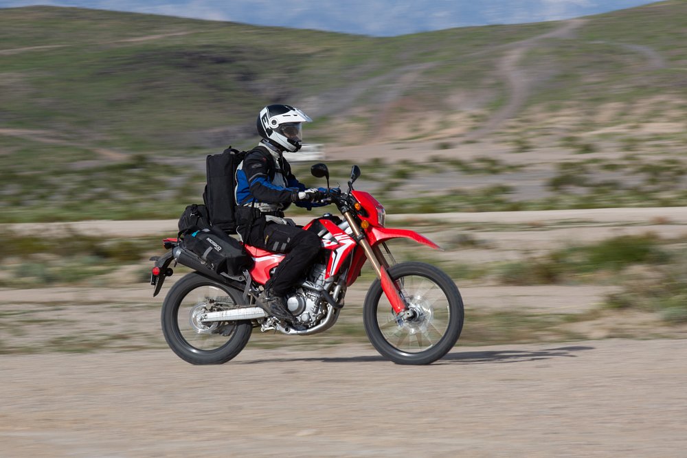 We planned to be off the grid for a few days in order to torture test the durability of the Chinese- and Indian-made ADVs, so I loaded my camping supplies into a Reckless 40L luggage system, stuffed the cameras into a Tenba Cineluxe 21 backpack, and hit the road on a (Thailand-made) CRF250L. The first bit of riding was a 130-mile stint on the freeway and I wasn’t confident my steed would hang with the larger, touring-oriented bikes Zack and Ari were riding.