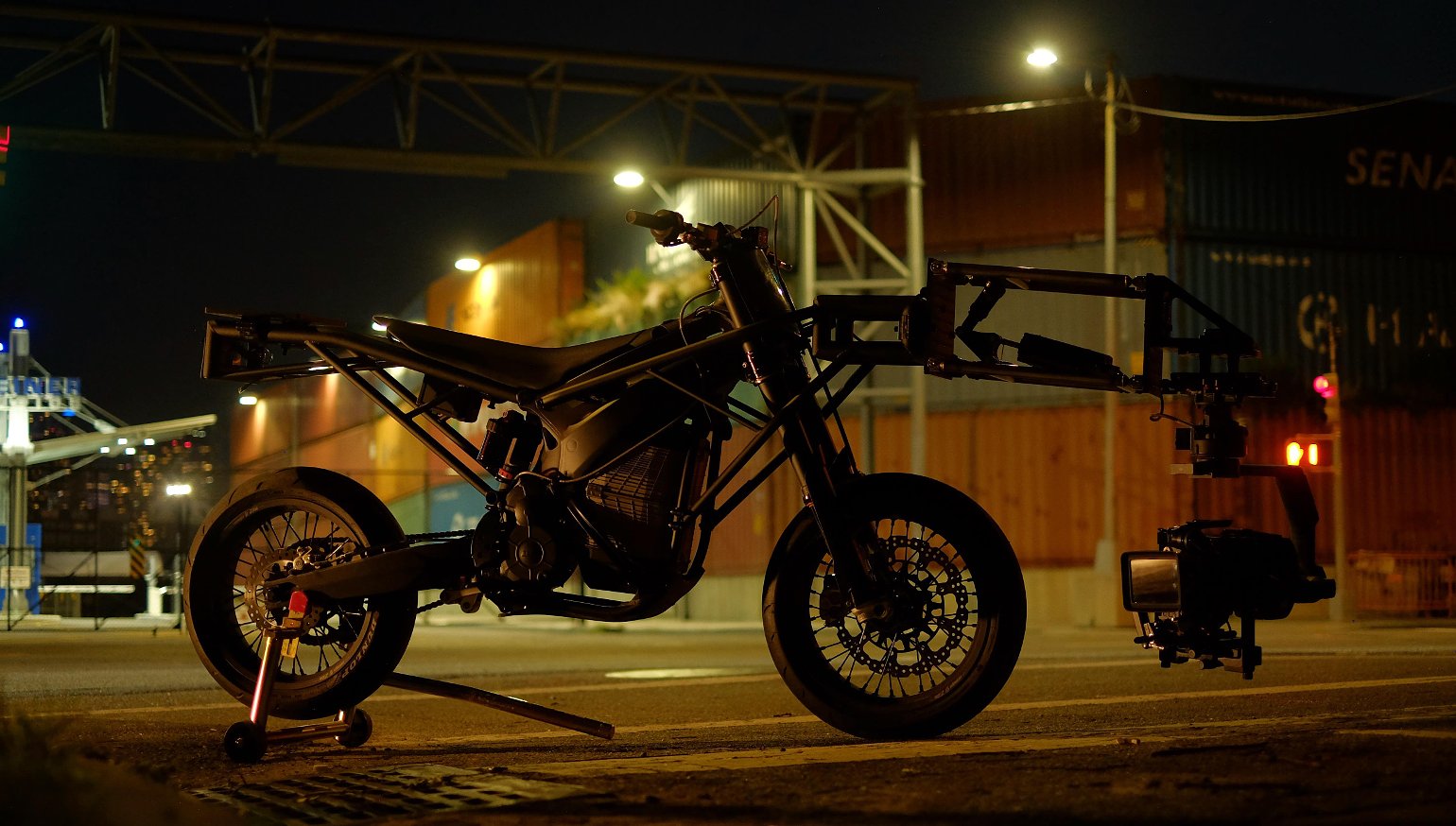 The Agile bike is the brainchild of Gareth Jackson and Leo Schott, young film-industry veterans and motorcycle enthusiasts based in Brooklyn. They grew weary of complaining to each other that they didn’t have the right system on hand, so they set out to build it themselves. At its core the bike is an Alta Redshift EXR, stripped of its bodywork, then customized to carry and control a state-of-the-art camera. Jackson and Schott chose the EXR for its size and power characteristics — the fact that Alta ceased production and disappeared within weeks of the initial purchase was pure bad luck. They have since sourced a backup machine, which is used for buzzing around the boroughs and as a donor for replacement parts.