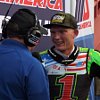 New Stock 1000 champion Andrew Lee is interviewed after his race win by track announcer Jonathan Green. Photo by Lance Oliver.
