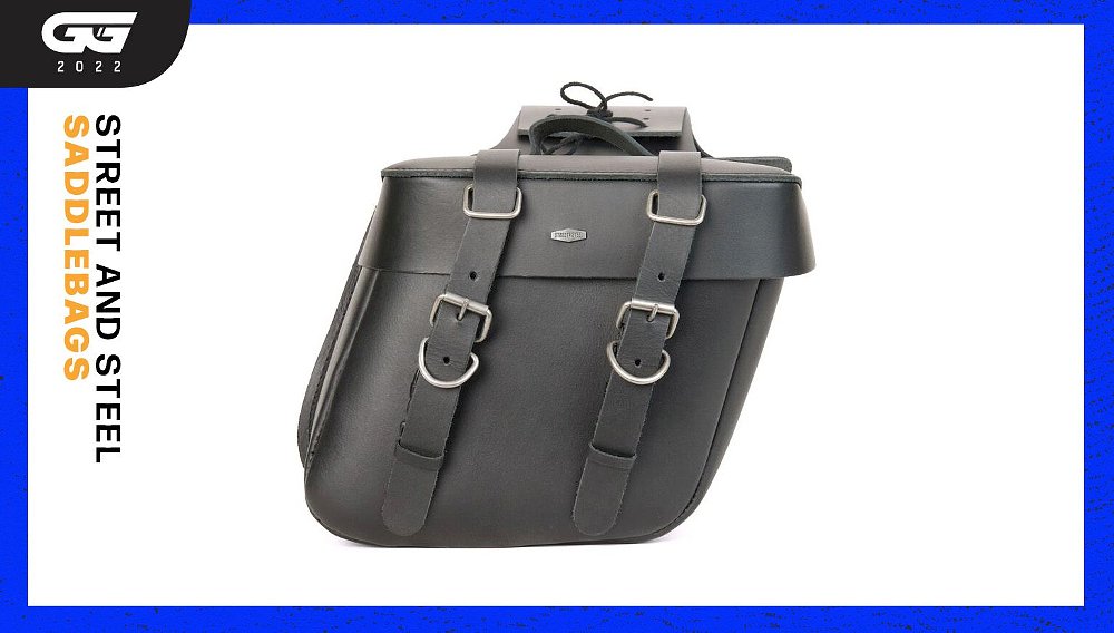 Street and Steel Slanted Saddlebags are great for adding that capacity you need for anything from a trip to the store to a cross-country road trip. They are a heavy-duty buffalo leather throw-over-style set of bags. That means they will work with basically any style of cruiser motorcycle. The three-millimeter full-grain buffalo leather bags are available in a small and large size, have a full coverage lid with leather over straps featuring quick-release buckles so you can get at your cargo easily. The adjustable yoke in the center allows you to tailor the bags to fit your ride and mounting is very simple. You lay the bags across your bike, either over or under your rear seat, and tie the bottoms off to a point on the frame.