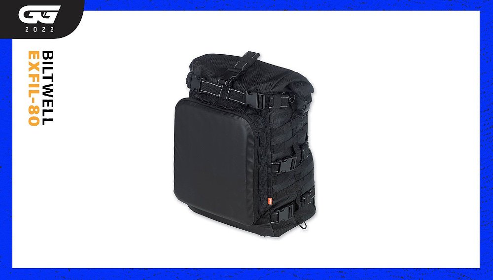 The EXFIL-80 is made from UV-treated 1680 denier ballistic-grade nylon with an integrated tool compartment. The roll-top closure has a Velcro strip and nylon quick-release buckles to keep things sealed up tight with a PVC-coated nylon bottom panel that is impervious to water. It has zipper pockets for roadside repair essentials that can be opened without removing the bag from your motorcycle. It's a well thought out piece with features like a hi-vis orange lining in the main and secondary compartments to help you see your gear and a padded backrest for your comfort. Interior volume is 51 liters (or 80 beers) and includes a weather-resistant cover for 100 percent waterproof protection.