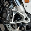 The braking system is now manufactured with components from Nissin, Hayes, and Brembo. The front master cylinder is a Nissin unit pumping fluid to two radial-mounted, four-piston Hayes calipers clamping down on 320 mm steel rotors. The rotors are each 4.5 mm thick and together they weigh about a pound less than their predecessors. At the rear there is a single-piston Brembo caliper and a 220 mm rotor.