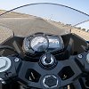 Approaching Turn 10 at Buttonwillow Raceway on the ZX-10, with significant lean angle and 150 mph showing on the dash. Image by Zack Courts.