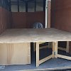 Then the hard work began. He built structural supports for the solar panels and a ceiling vent fan. Plywood interior panels were removed to insert insulation and wiring. He cut holes in the side and door of the trailer and installed three windows. With panels back in place, the commercial grade polyvinyl garage flooring was laid down, also covering the ramp door. Extra D-ring tie-down anchors and chocks were put into place. A friend machined plates so that chocks could be put in and out without going under the trailer.