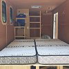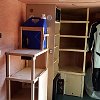 He designed an ingenious system for a large fold-out storage box to hold gas cans, the generator, and rain tires for track days. Together with a fold-out frame, this becomes the base for the bed. Two custom-sized mattresses store neatly out of the way in the ceiling, but when lowered, form a comfortable queen-sized bed. He built a fold-out table and plenty of storage space, interior and exterior lights, USB charging ports, and installed an awning on the outside.