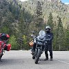 We stopped at a gas station in Silverton, elevation 9,318 feet. They offer oxygen. We got oatmeal cookies and tortilla chips. A guy had just come down from higher up the mountain, in snow, on his Yamaha Ténéré 700. He was sitting outside, propped up against the building. We gave him the rest of our chips.