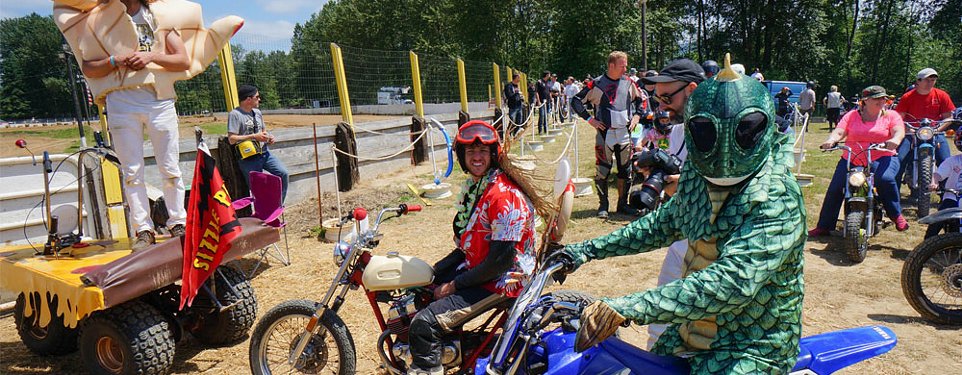 The idea of a motorcycle race is equal parts terrifying and exhilarating. I have to imagine that racing of some sort has to be the oldest sport in history, with little cave boys challenging other cave boys to race to see who gets first dibs at the dinosaur teeth or something. If I were ever to overcome the terrifying part to experience the exhilirating part of racing, it would be through an event like Dirt Quake USA. Who can resist totally inappropriate bikes ridden by "racers" wearing totally ridiculous gear and, in most cases, not blessed with professional-level talent?