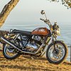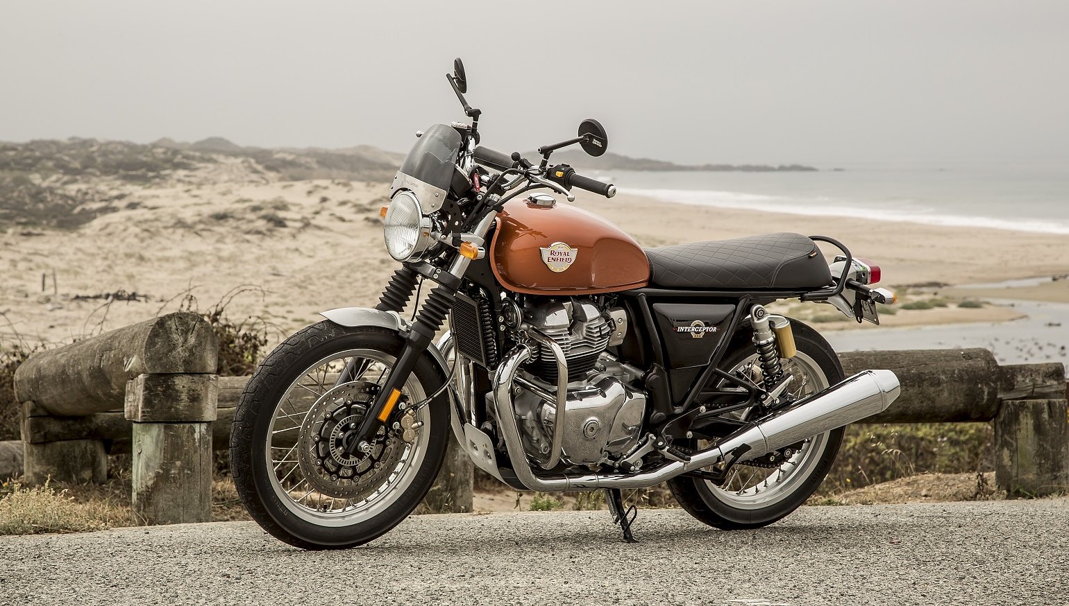 Royal Enfield Interceptor 650 parked on a bluff overlooking the ocean