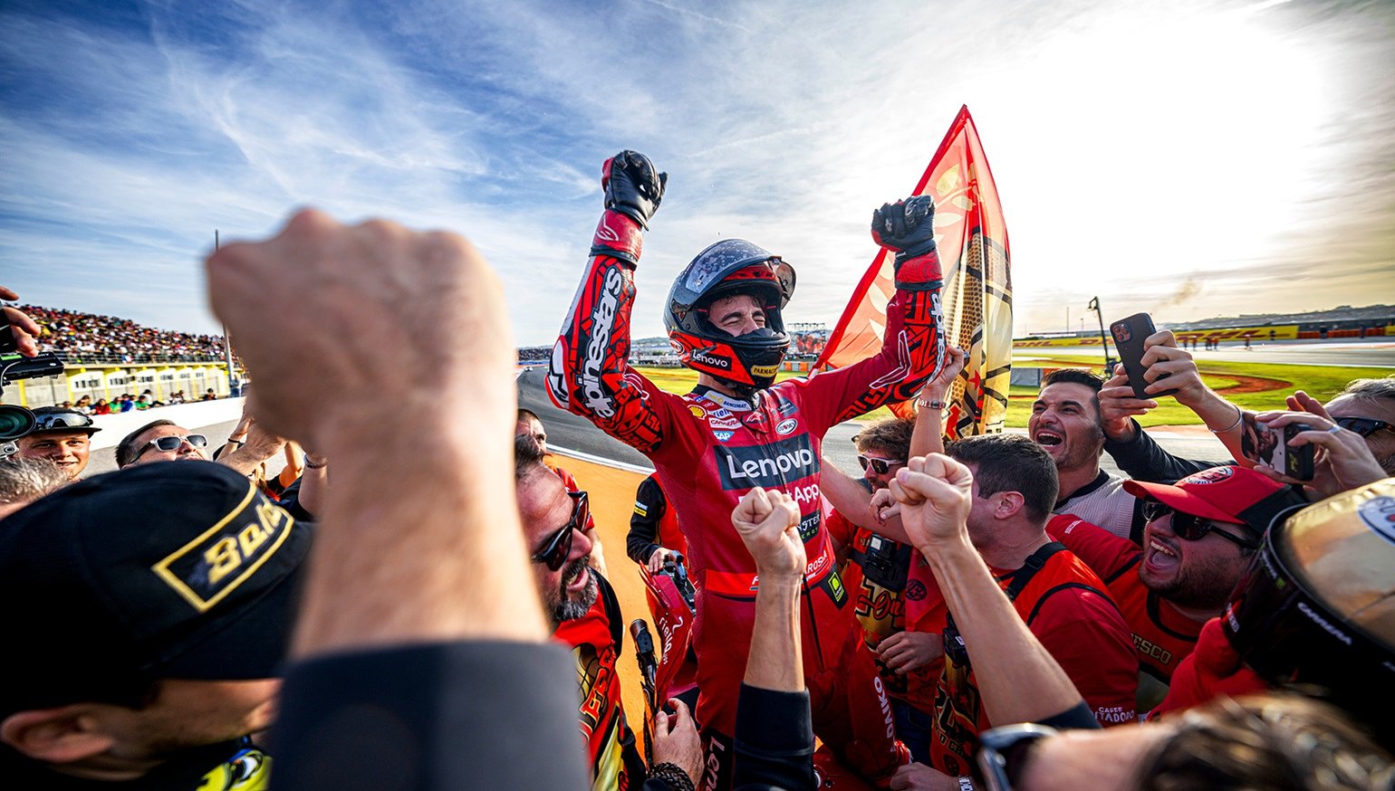Ducati Lenovo rider Pecco Bagnaia won the 2023 MotoGP World Championship yesterday after his last challenger, Prima Pramac Racing's Jorge Martín, made two large errors in his furious attempt to win. The first nearly caused a crash with Bagnaia and the second caused a scary crash with Repsol Honda's Marc Márquez, ending Martín's race and title hopes and ending Márquez's spectacularly successful career with Honda on a down note.