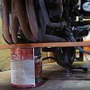 Gasket removal is probably my number one pain-in-the-ass task in the garage. To speed the process along, one of the guys showed me how to affix a extremely fine-gauge 3M polishing pad to a pneumatic polishing wheel. Worked like a charm. I then got the bright idea to apply this same trick to removing a gasket from the oil pan of my Triumph Bonneville T-100.