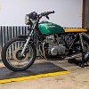 Next, get the front end in the air using your method of choice. I'd have to remove the aftermarket pipes on the KZ to use my motorcycle lift, so I’m just using a rear stand and a small floor jack instead. Slip a small piece of wood between the jack and your bike to prevent damage.