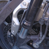 With the bike on its sidestand, tighten the left strap just enough to take the slack out of it, then tension the right strap. You’ll need to push on the bike to tighten the strap, and you can either put your hip into it if you’re on the left side of the bike or pull on the handlebar if you’re on the right side. As you tighten the right strap, the bike will lift up and off the sidestand, compressing the fork and adding tension to that left tiedown that you’d barely snugged. Typically, once the bike is vertical the fork will be about halfway compressed and the tie downs will be adequately tensioned, but give the bike a good rock to check. If either strap goes slack, cinch the bike down more. Finally, you gotta say “That’s not going anywhere!”