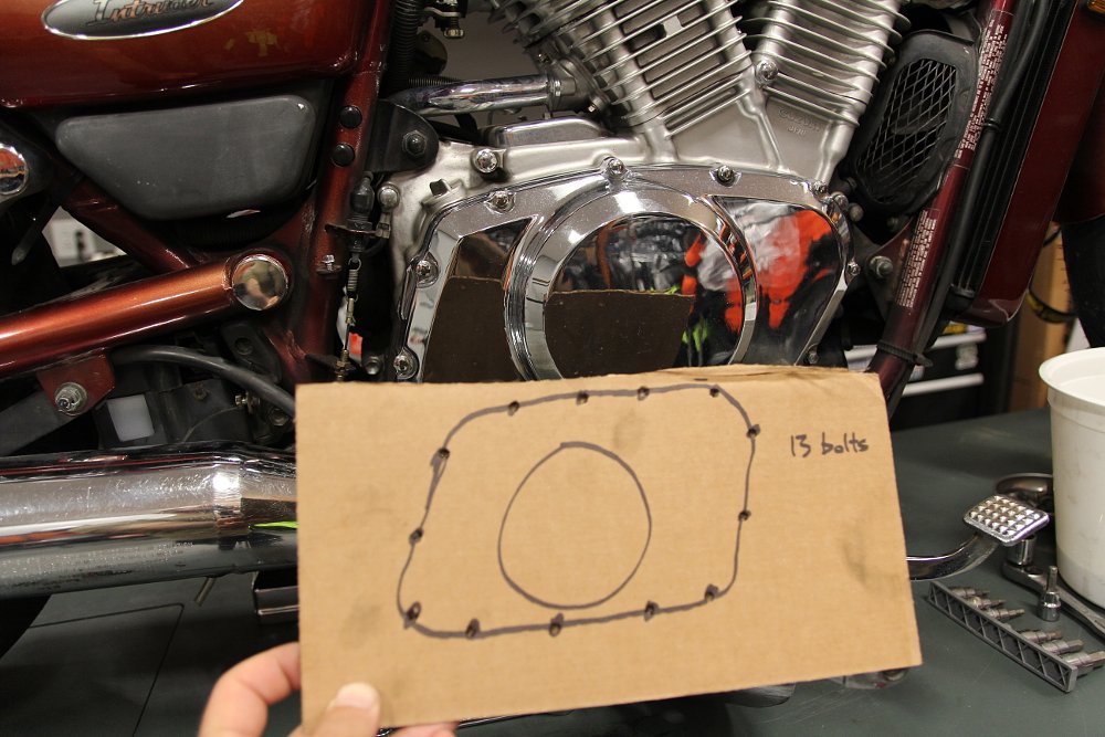 Start by removing any parts that are in the way of accessing all of the clutch cover bolts or items that would prohibit removal of the cover. Most covers use different length bolts to hold them on. I use a piece of scrap cardboard and sketch a picture of the cover on it with a marker. Then, I poke holes in it with a screwdriver to allow me to insert the clutch cover bolts in it as I remove them from the bike to keep track of which bolts go in which holes.