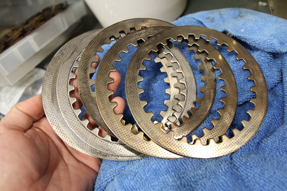 A few of our steel plates were showing that they were very hot at some point, but not so bad that they became warped, so these will be reused. The manual does recommend replacing the steel plates, friction plates and springs all at once but we do have to be mindful of the budget on this bike. If you are reusing the steel (non-friction) plates like we did here, it is important to clean them thoroughly to ensure there is nothing on them that might make the new friction plates slip, such as someone using the wrong type of oil previously.