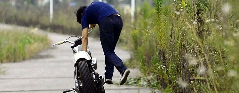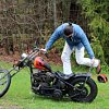 Textbook form demonstrated when kicking the motorcycle. White pants are a nice style touch one can add between Memorial Day and Labor Day in the United States. Photo by Lemmy. - Notice liquid on top of tank