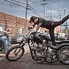 Starting bike, rider with strangers and attractive members of opposite sex watching