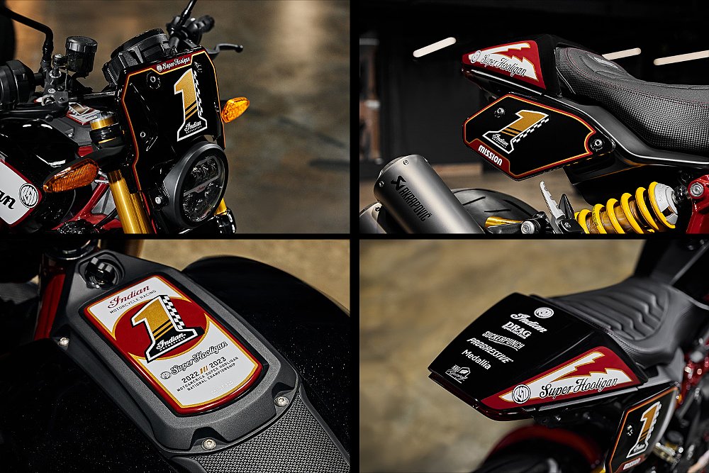 In true Super Hooligan fashion, the latest FTR sports a fly screen resembling a front number plate and two tail-mounted side plates. For that extra bit of authenticity, the seat cowl also bears team sponsor logos from Drag Specialties, Progressive Insurance, and Medallia. Indian distinguishes all 300 FTR x RSD Super Hooligan units by stamping a serialized number on the tank console.