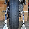 You might not even know what a spool is. (I believe our British readers refer to them as "bobbins.") Spools are little doodads that thread into your swingarm to make it possible to use a rear stand (again, "paddock stand" to you Limeys), as shown in the photo up top.