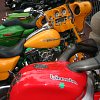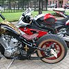 Where else will you see a Bimota parked beside a Harley-Davidson with green accent lighting? Everyone is welcome at Motorcycles on Meridian. Photo by Lance Oliver.This leads to my favorite activity at Motorcycles on Meridian: taking photos of bikes parked next to each other that you would never normally expect to see in the same place at the same time, such as a Bimota next to a Harley with LED accent lights, or a pair of customized Groms next to a matte-black Sportster and across from a stretched Hayabusa.