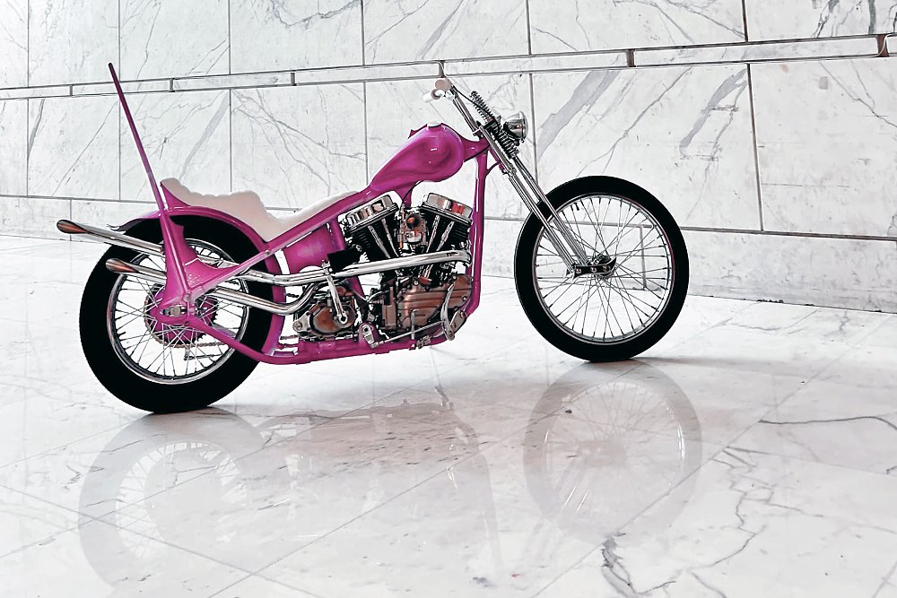 Gear changes are managed by a foot clutch and hand shifter on the left side of the engine. The foot controls themselves are unsurprisingly custom, too, as is this slash-cut exhaust that sits snugly between the frame and wall of the rear tire. Looking at this bike, there's no ignoring its garish graduated pink paintwork completed by Mirko's go-to painter, Riko Kustom Paint. It's not a color for anyone who doesn't like attention, but let's face it, choppers aren't built to blend in!
