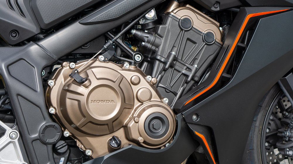 Inline-fours are commonplace on the race track for a good reason: horsepower. Short strokes, high revs, and compression ratios in the teens help achieve those results. There’s just one catch. I4s typically produce most of their horsepower at higher engine speeds, which aren't as easy to access in street riding. The CBR650R’s four-cylinder is different, however.