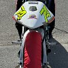 After gearing up and preparing, I faced the initial challenge: starting the bike. It lacks an electric starter and is basically impossible to push-start. The only viable method involves using an electric roller starter, which we didn't have at our disposal that day. So, we improvised by placing a Honda CRF50 pit bike on a pit stand, aligning it with the NSF, both bikes on stands, and touching their rear wheels together to spin up the NSF's rear wheel. Then, in third gear, I released the clutch, and the NSF barked to life.