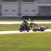 But when he got off the racing line, Olmedo was out in the dirtier part of the track, lost traction with the rear tire and high-sided, falling right in front of Doyle and Jigalov, ending all three riders' chances at a podium. Olmedo was lucky not to be injured, either from the crash or being hit by the other two, and came away with nothing worse than a bruised arm. Landers then drafted past Blackmon at the finish line to deny him the win by inches.