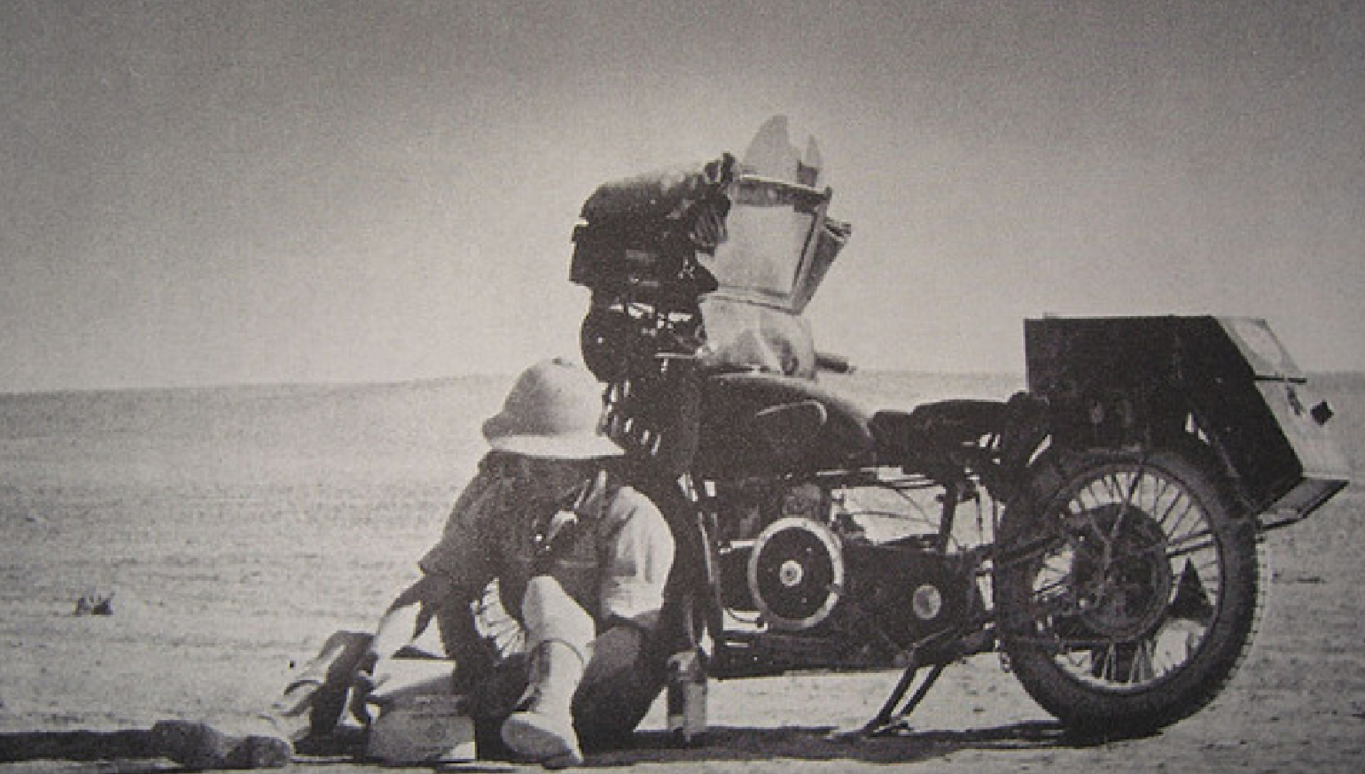 Fulton didn’t know he was sitting across from Kenton Redgrave, owner of Douglas Motorcycles. Redgrave loved the idea and offered a free machine, plus any modifications necessary for the journey. Unable to back down from his bluff, especially now that a free motorcycle was at stake, Fulton bought some maps and got to work. Modifications to the Douglas included a second fuel tank, more storage, a windshield, and car tires in a common size for easy repairs and replacements. With the extra fuel, the Douglas could go 350 miles between fill-ups, averaging an impressive 50 miles per gallon. With the bike ready and “adventure...crooking her finger and beckoning,” motorcycle and rider set off into the unknown.