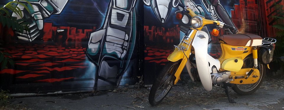 Travis lives in Sacramento, California. He walked out of his house one morning with a 10 mm wrench in hand, looking to do some work on his project bike, a 1981 Honda C70 Passport. He’d bought the bike as a project for $100, and had been improving it as he went. He’d installed a seat from a C90 and an auxiliary fuel tank. But when he went outside that morning, it turned out the bike appeared to have grown legs overnight.