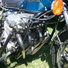 Now, I had an idea of how this guy modified his sidecar rig, and why he did it, so for those of you who are not following me, you'll be up to snuff shortly. See how the engine is not centered in the frame? It's offset to the right. I asked the old-timer if he did it for better weight distribution, and he smiled and said, "Yes!" (I think he enjoys getting shaken down by someone who knows what they're looking at.) I then asked if I could take a guess at how he did it, and he agreed. My suspicion — which the codger confirmed — was that he flipped the rear wheel, moving the drive line to the right side of the swingarm.