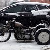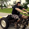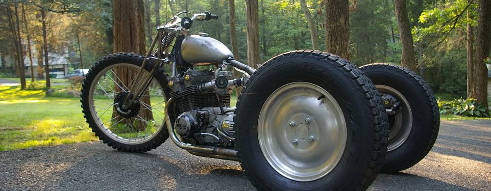 A buddy of mine, Hutch, built a cool trike a few years back. It has a homemade frame, a Honda CB900 powerplant (complete with 10-speed transmission!) a rear end from a Suzuki Samurai 4x4, and the wheels are spares from an old Ford Thunderbird.