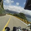 rider's view aboard the motorcycle on a road along the ocean with mountains on the left