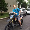 author in shorts and a shirt and no helmet sitting on his RX125 motorcycle