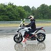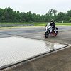 For the first test, I found myself on a Multistrada fitted with an outrigger, rendering it uncrashable (or so I was told), staring at a road paved with slippery tile being wet down by sprinkler systems. While most riders don’t find themselves riding on slippery tile, this surface was built to test straight-line ABS and traction control, like a rider experiences when the parked car pulls out in front of you or you ride over the wet manhole cover or oil patch.