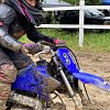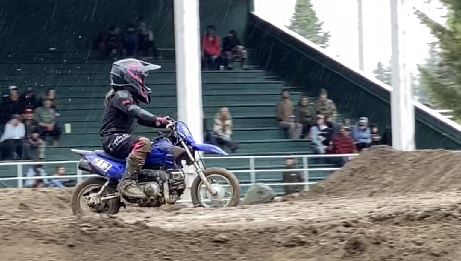 After her first ArenaCross moto, Gabbi parks her TT-R50 out of the rain and joins her Aunt Andrea in the stands to watch the next race. Andrea and I had temporary guardianship of Gabbi and her younger sister for seven months when they were younger. Gabbi and Andrea bonded on a level few aunts get to experience. Andrea is so proud of her bravery and tells her she did great. Gabbi is discouraged because she fell so many times. But then Andrea tells her all the girls were falling and it helps a little. When the 250 Junior race starts, she sees for herself how many times they fall. She is almost convinced. The track conditions are as slick as can be and the ruts are at least axle-deep on the 250s, making them feel more like crevasses for the TT-R50.